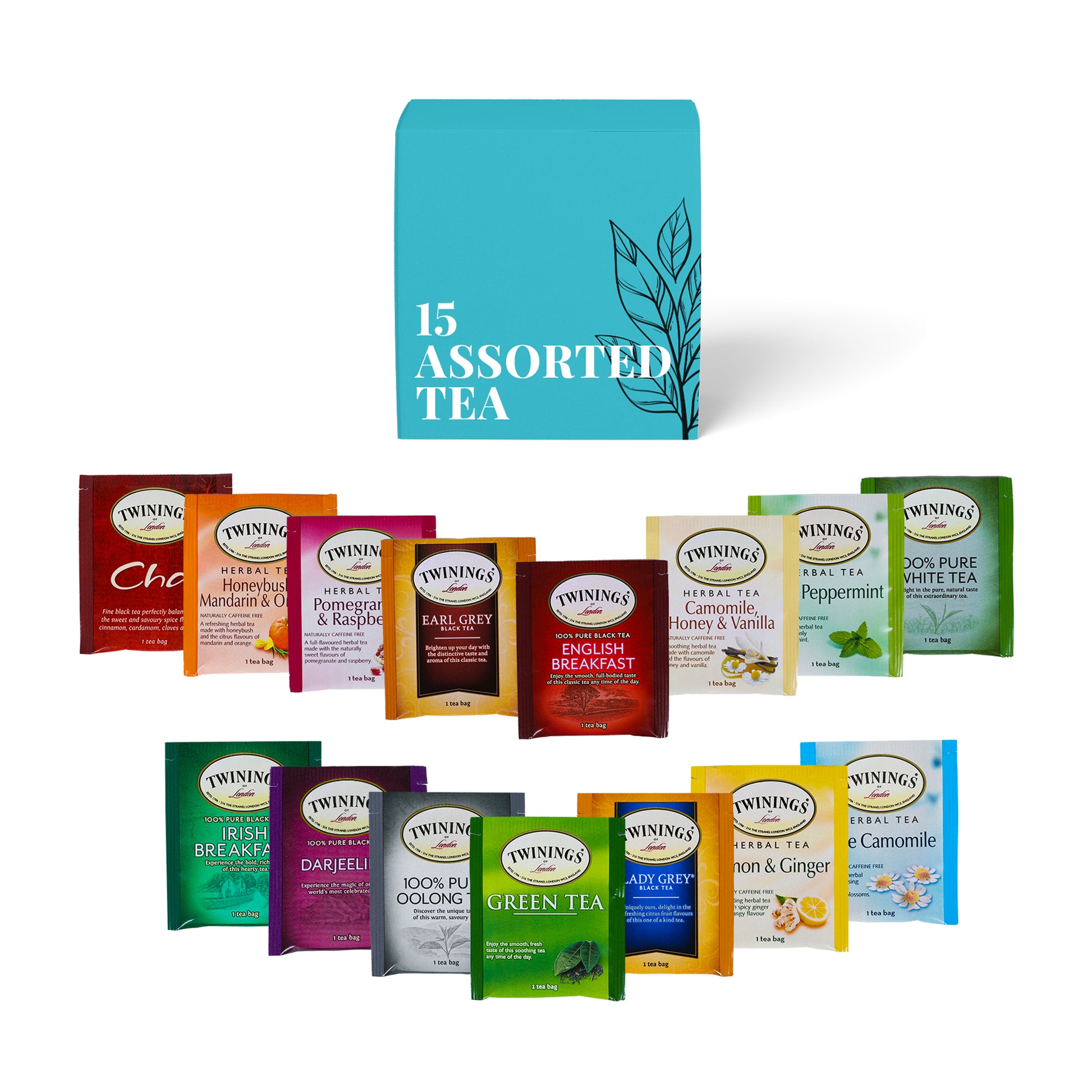 - A variety of 15 individually wrapped Twinings tea bags, including beloved classics like Earl Grey, English Breakfast, Green Tea, Peppermint, Chamomile, and more.