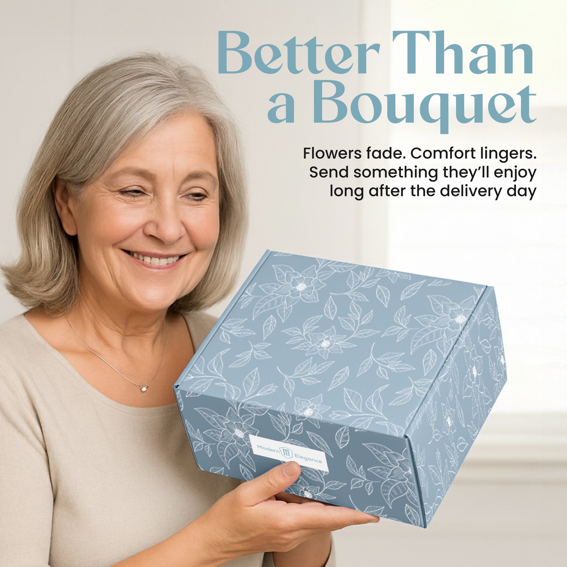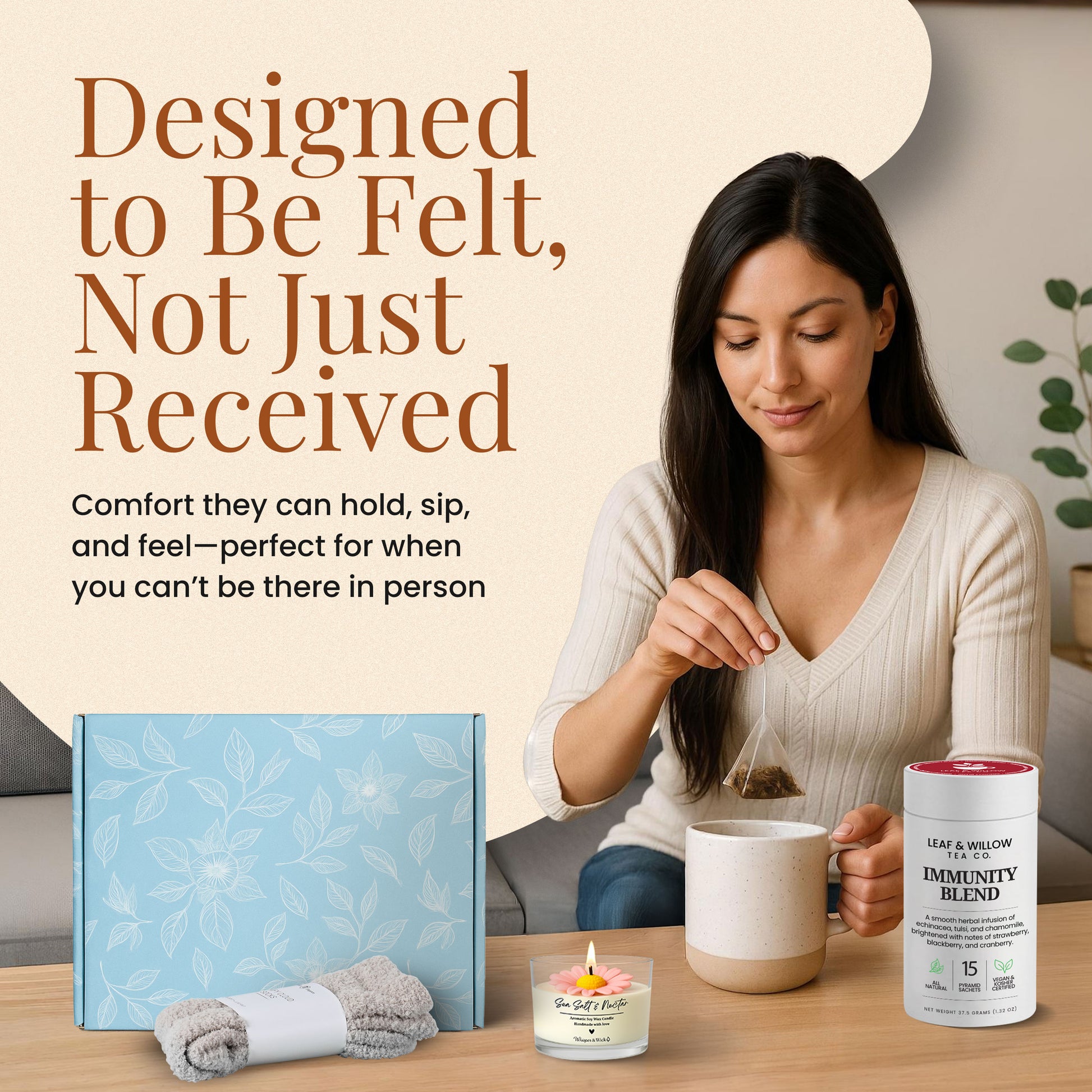 Send comfort, care, and encouragement in the most thoughtful way with this beautifully arranged gift box. Each set is filled with carefully chosen items to bring both joy and relaxation, including a ceramic mug, cozy cloud socks, and a hand-poured candle with a flower-shaped design. To make it even more personal, every package includes a heartfelt “Sending Hugs” card—the perfect finishing touch that turns a simple gift into a lasting memory. Choose between our Wellness Tea Blend, crafted for soothing moments of calm, or our Immunity Tea Blend, designed for times when health and recovery come first. Whether you want to inspire relaxation or provide uplifting support, each blend adds warmth and comfort with every sip. Arriving in a decorative, gift-ready box, this collection is more than just a gift—it’s an experience. No wrapping, no extra effort, just a beautifully presented package ready to brighten her day. Perfect as a get well soon gift, recovery basket, self-care kit, birthday surprise, or thinking of you package, this thoughtful set combines practicality with heartfelt sentiment, making it a truly meaningful way to show you care.