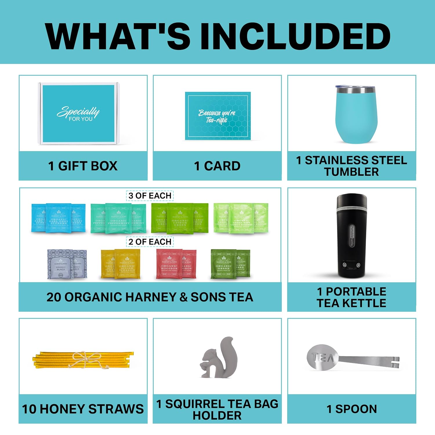 - Tea Gift Set with Kettle - Discover the joy of tea with our luxurious Tea Gift Set, thoughtfully assembled in a beautifully crafted gift box. This set is a treasure trove that includes 20 assorted organic teas, a sleek 12oz vacuum insulated tumbler, a high-quality stainless steel kettle, 10 pure honey straws, a tea-spoon squeezer, a charming silicone squirrel tea bag holder, and a greeting card for personalized touches. An ideal tea gift set for women and all tea lovers.