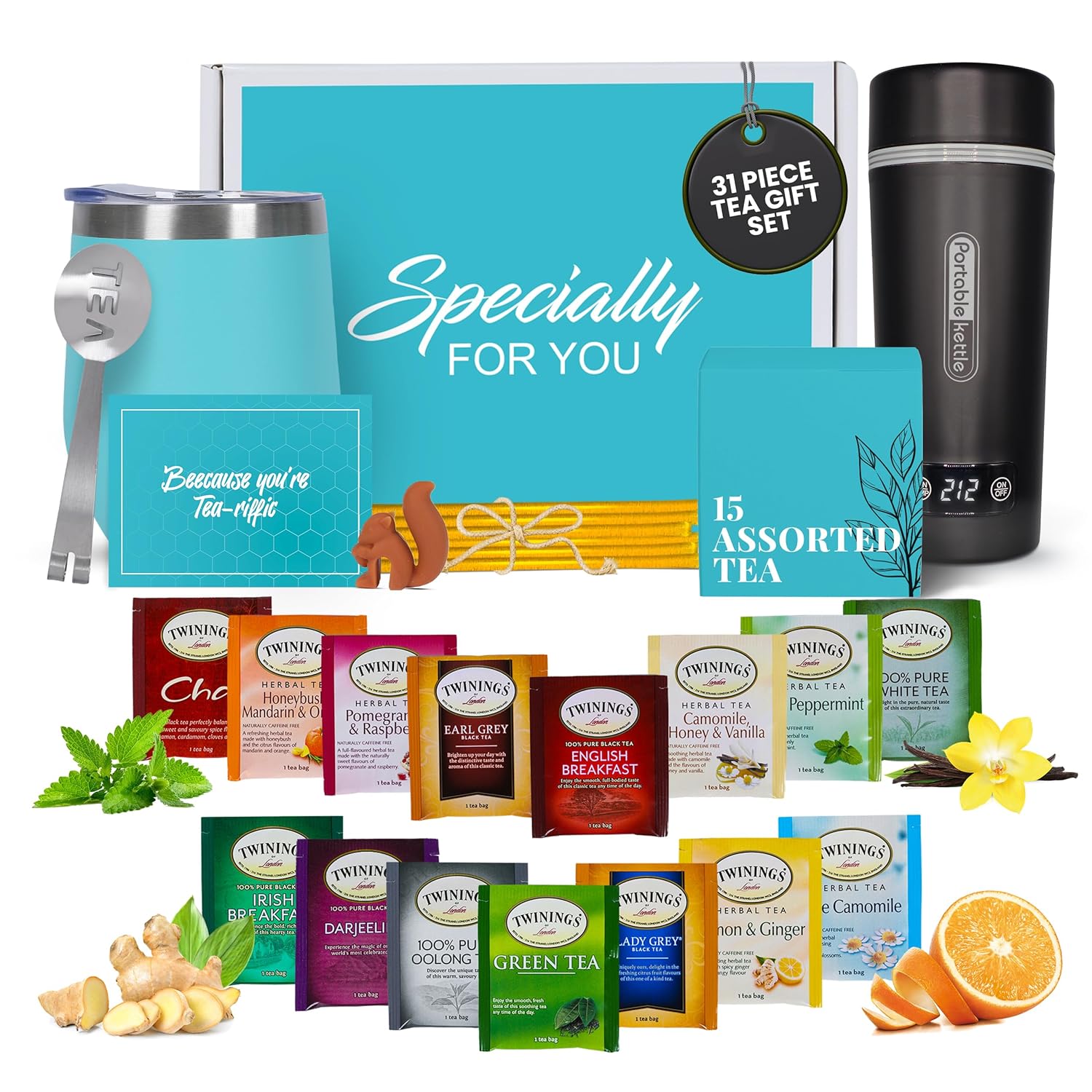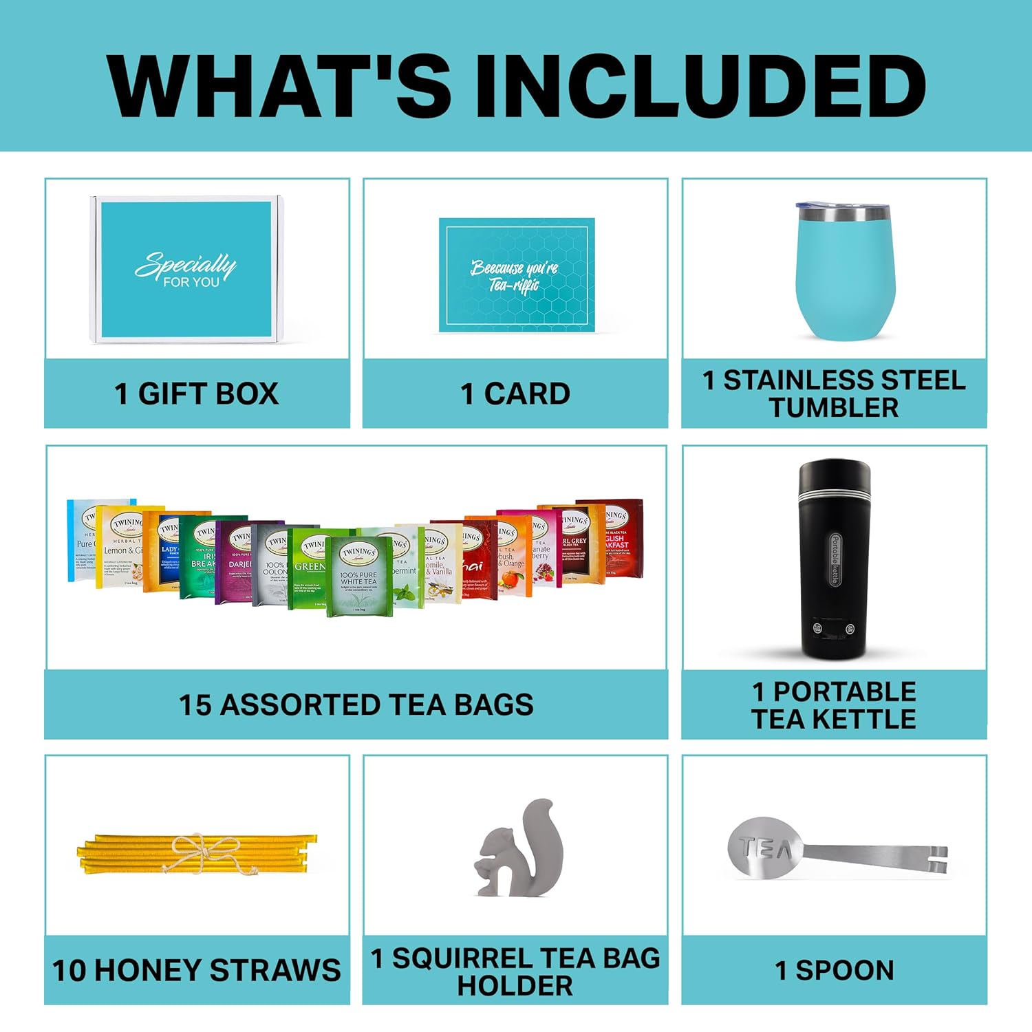 - Tea Gift Set with Kettle - Discover the joy of tea with our luxurious Tea Gift Set, thoughtfully assembled in a beautifully crafted gift box. This set is a treasure trove that includes 20 assorted organic teas, a sleek 12oz vacuum insulated tumbler, a high-quality stainless steel kettle, 10 pure honey straws, a tea-spoon squeezer, a charming silicone squirrel tea bag holder, and a greeting card for personalized touches. An ideal tea gift set for women and all tea lovers.