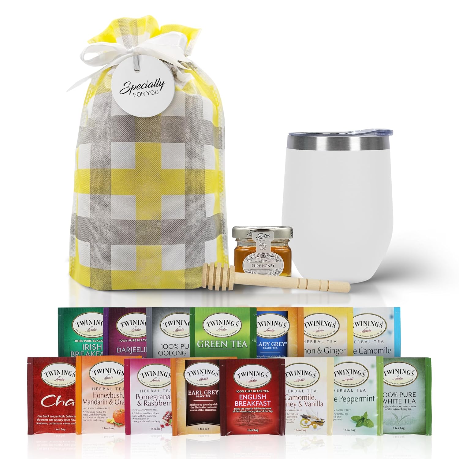- Thoughtful Tea Gift Basket - Send your warmest wishes with this beautifully curated tea gift set. Includes a tea sampler, an elegant vacuum insulated stainless steel tea mug, and a jar of natural honey. Perfectly presented in a stylish drawstring gift bag, this set is ideal for any occasion.
