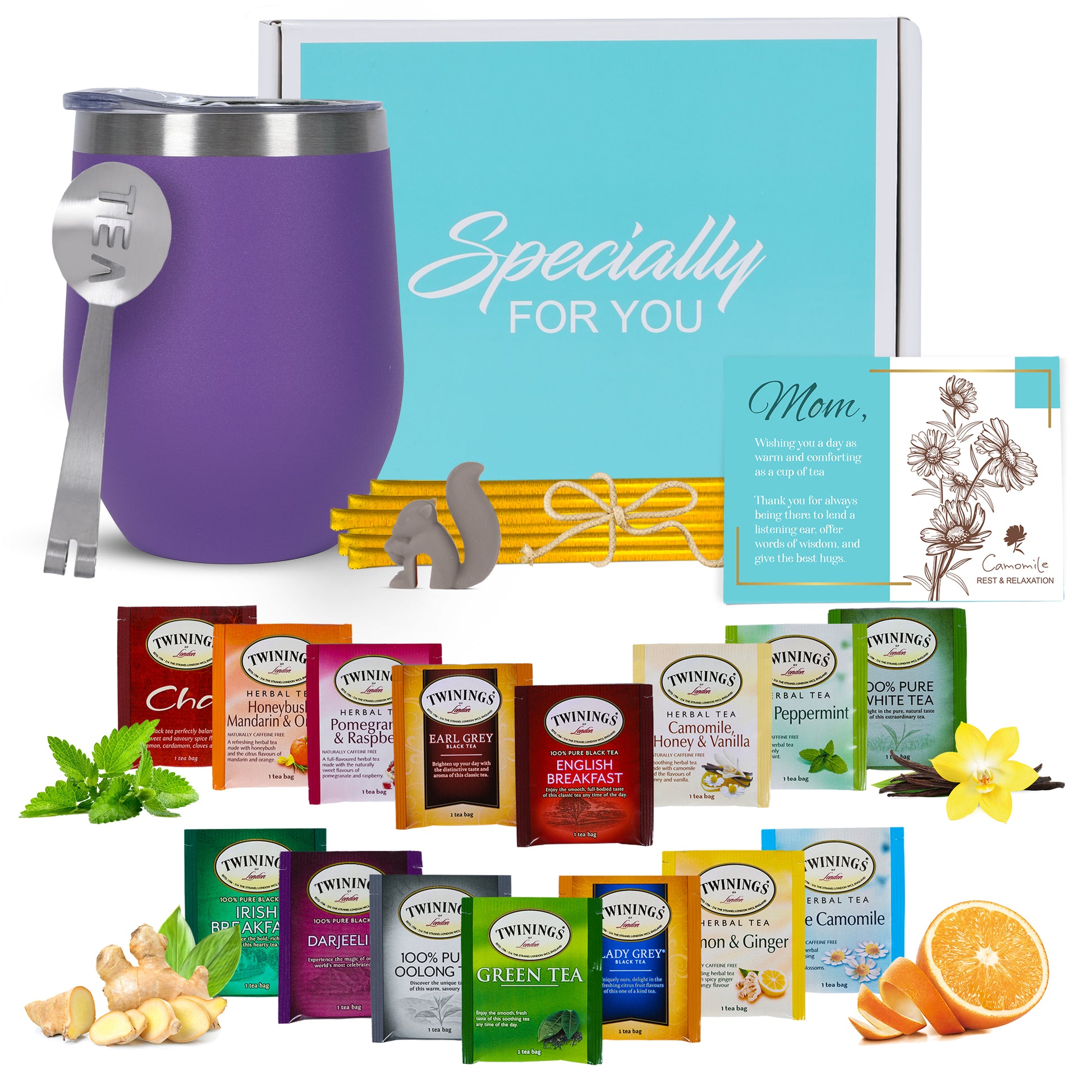 - TEA BAG STRAINER & HOLDER - To complete the tea sampler gift set box we have included our handy stainless steel tea bag squeezer that strains and releases extra liquid safely from the tea bag. Our tea bag holder is made of food grade stainless steel material, durable and resistant to rust. We have also included an adorable silicone squirrel to hold your tea bag securely to the edge of your tea cup for a stress-free experience.