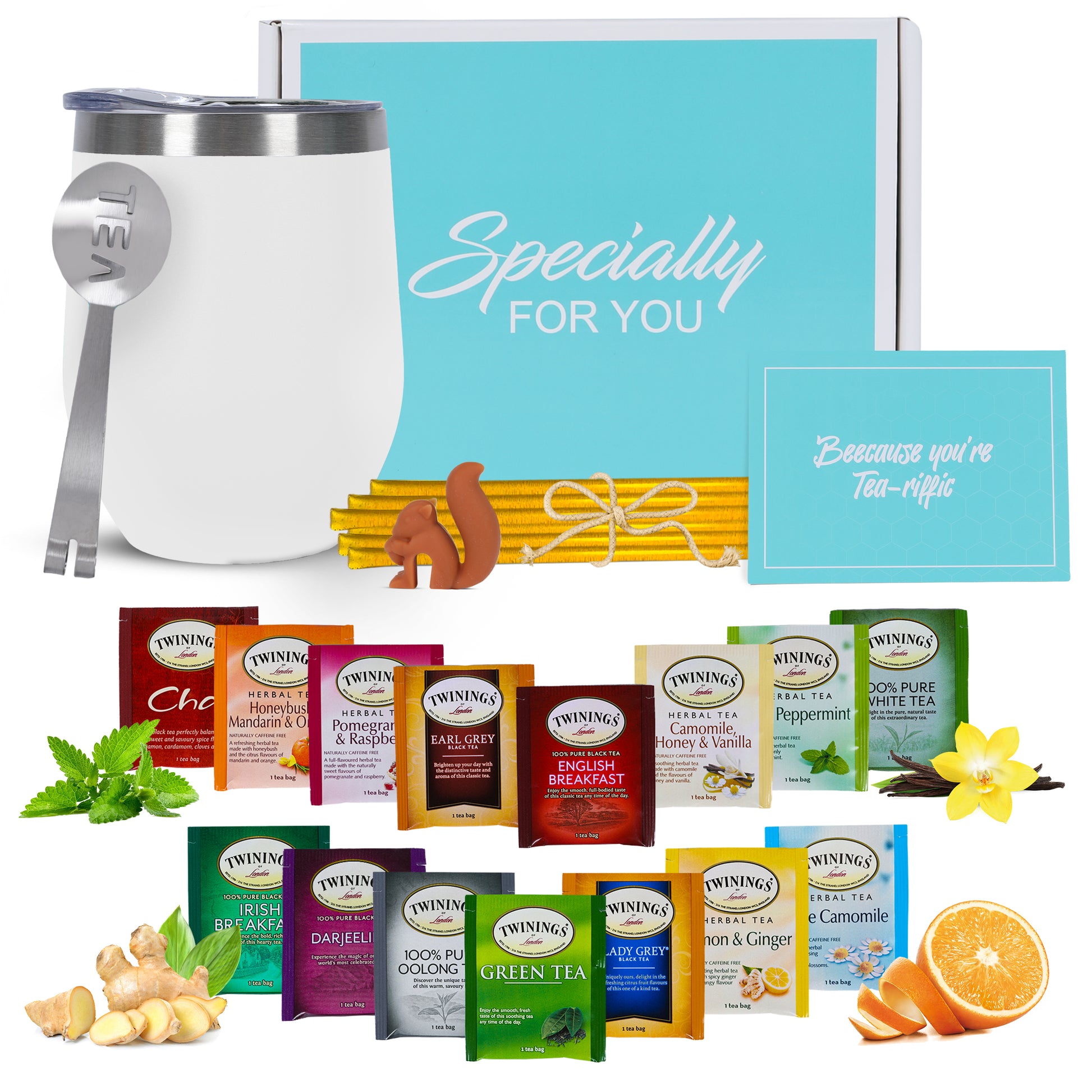 TEA BAG STRAINER & HOLDER - To complete the tea sampler gift set box we have included our handy stainless steel tea bag squeezer that strains and releases extra liquid safely from the tea bag. Our tea bag holder is made of food grade stainless steel material, durable and resistant to rust. We have also included an adorable silicone squirrel to hold your tea bag securely to the edge of your tea cup for a stress-free experience.