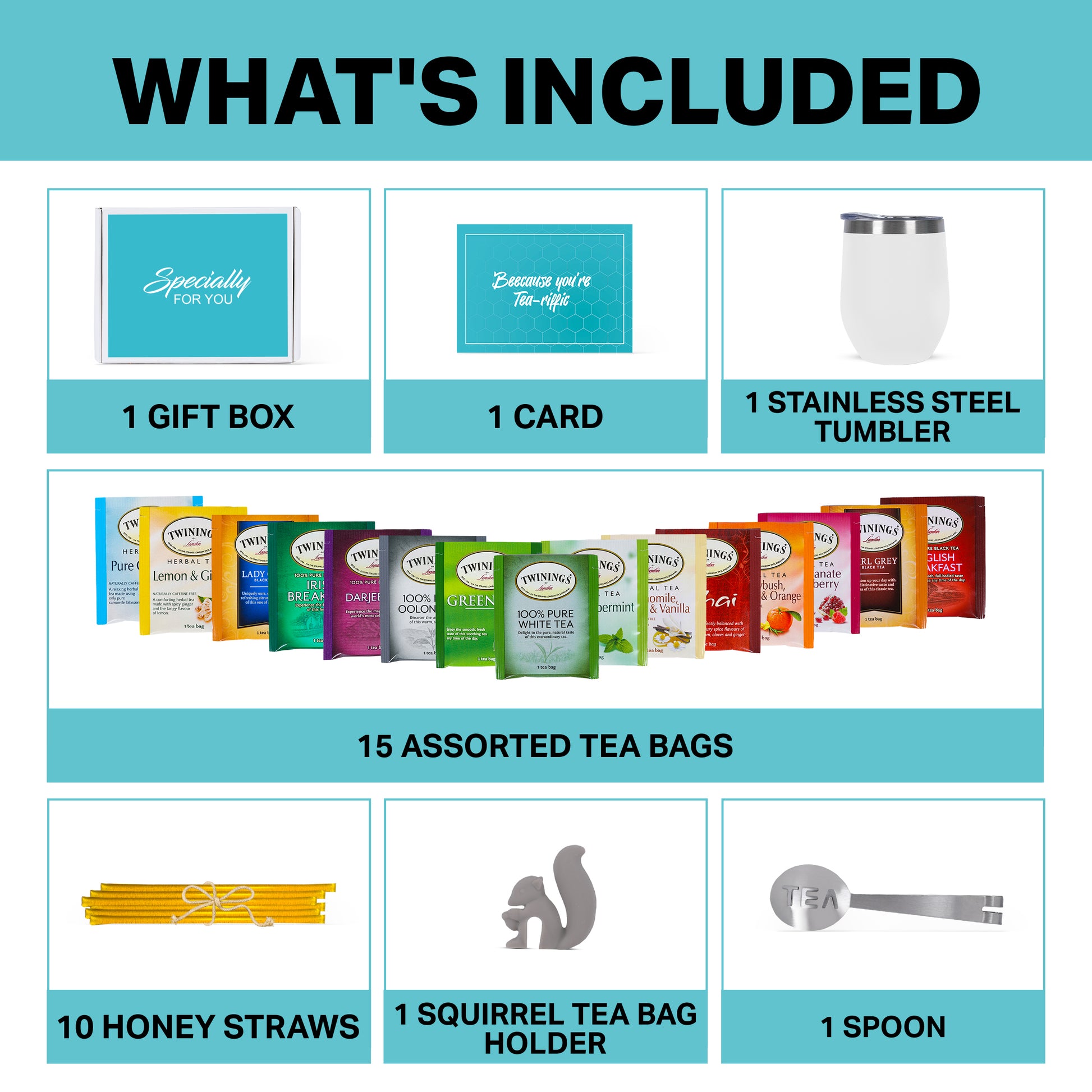 TEA KIT GIFT SET - Presented in a beautiful tea basket gift box. Modern Elegance's tea and honey gift set includes a 12oz vacuum insulated tumbler; with a BPA-free sliding lid. A tea collection gift set sampler of 15 different Teas (herbal, green, white, black and decaf), 10 natural pure raw honey straws, a tea spoon squeezer, a cute squirrel to hold your tea bag and a greeting card to write a personal message. Each item was carefully selected, designed and packaged in the USA to make this the perfect gift for tea lovers or as a feel better get better soon care package.